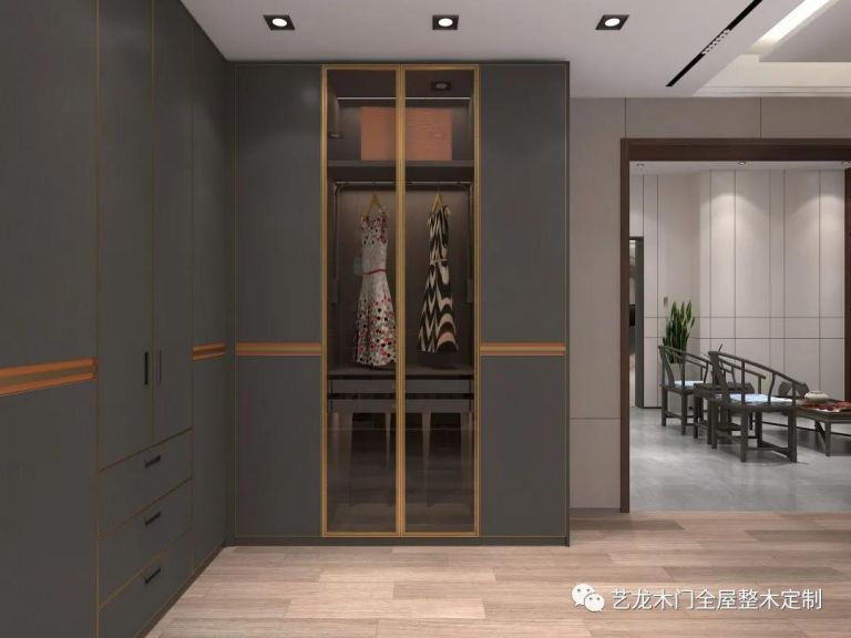 一般透明玻璃柜門,可以選擇茶色玻璃、灰色玻璃,避免了視覺上的凌亂,假如使用玻璃柜門,小編建議衣柜內部最好多規劃掛衣區,看起來更加具有視覺效果。